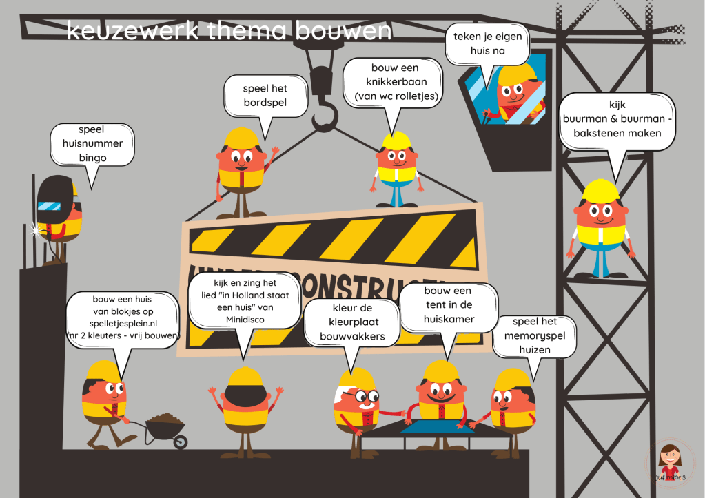 Een bouwplaat met verschillende opdrachten die horen bij het thema bouwen.