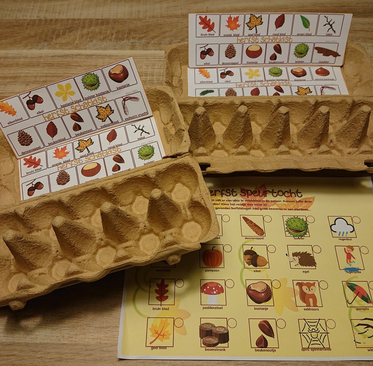 Bij het thema herfst heb ik een speurtocht en twee voorbeelden van een eierdoos schatkist gemaakt, je kunt ze hier downloaden :
